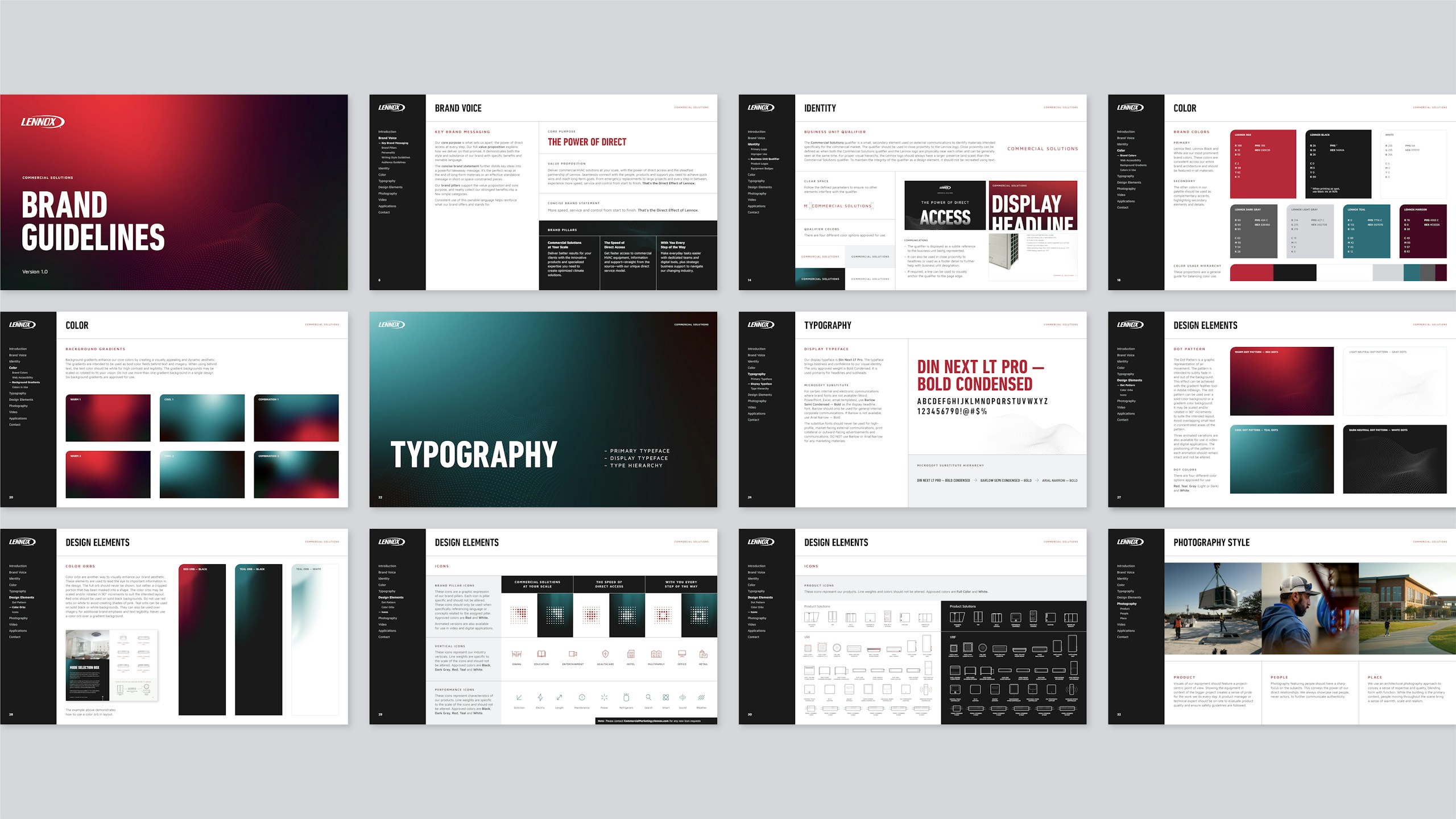 To create a more dynamic feel, we built on the existing Lennox brand with a set of commercial-exclusive visual elements including complementary accent colors, a secondary font, background gradients, iconography and signature animations.